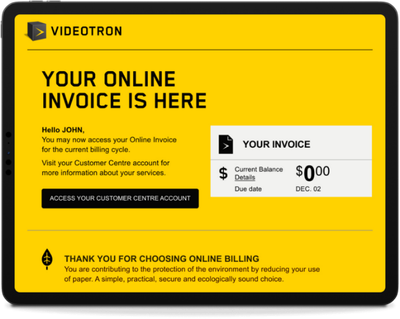 At Videotron, Helix subscribers automatically receive their invoice by email. If you still receive a paper invoice for other services, you can sign up for online billing in the Customer Centre.