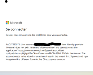 Bonjour Je suis mandataire pour l'internet de mes beaux-parent. lorsque j'essaie d'avoir acces au portail de videotron.com, je reçois une fenetre de microsoft pour me connecter chez microsoft. lorsque j'inscris le userid et mot de passe, j'ai la 2e fenetre qui ouvre. bien entendu que le compte n'est pas pour une entreprise, mais bien personnel. le but de ma demande est que c'est leurs fournir la facture de videotron puisqu'ils ne possèdent pas d'ordinateur a la maison. si dans la fenetre de microsoft, j'inscris mes coordonné je reçois ce message: j'ai essayé d'autres appareils qui ne sont pas connu dans mon reseau wi-fi, je suis en panne d'idée quoi faire. est-ce que qqun aurait eu le même problème que moi et a réussi a le régler ? Merciguyt3009-09-2025Initiate208Vues0like1Commentairedéploiement fibre optique à Rouyn-Noranda