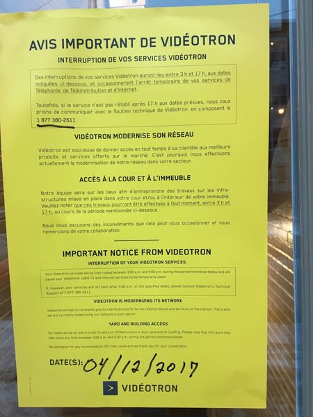 On a eut le plaisir d'avoir cette notification placardée a l'entrée de notre édifice... en plus d'un courriel et d'un téléphone avec message enregistré. Je salue la volonté de Vidéotron de v...