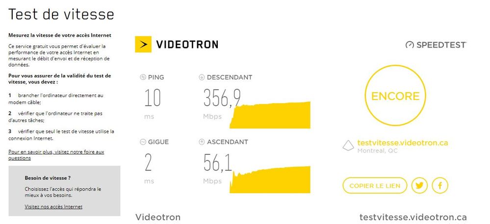 Avec le speedtest de Vidéotron, cela arrive que le premier résultat soit plus bas. Après le premier test, repesse sur Encore et tu vas voir que le second résultat sera plus élevé. Demandes moi pas pourquoi, je l'ignore.