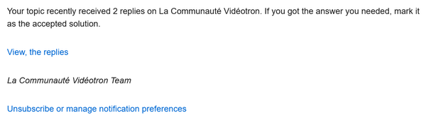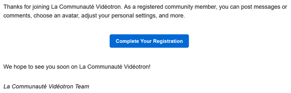 Le courriel de confirmation pour s'inscrire est en anglais et intitulé "Thank you for joining La Communauté Vidéotron!", ce qui est ordinaire.