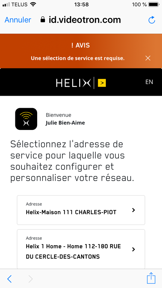 Je possède 2 bornes Hélix pour 2 adresses civiques différentes qui sont liés au même titulaire de compte. Lorsque que viens le temps de sélectionner la borne que je veux controller à partir de l'application Helix-Fi pour I-Phone, un message d'erreur apparait à l'écran (voir photos). Ma version de IOS est 12.4.8. Avec la version IOS 13 et plus, ça fonctionne, par contre, mon téléphonne ne peut pas avoir IOS 13. Pouvez-vous m'aider à régler le problème svp sans me demander de changer de téléphone?Avant sélectionAprès sélection