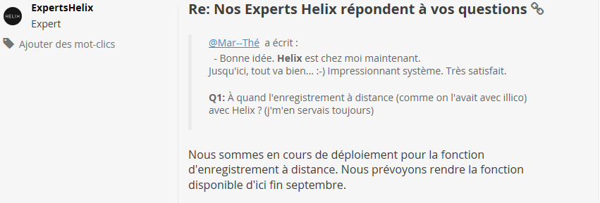 Quand pourrons-nous enregistrer à distance sur l'application Helix sur iPhone?