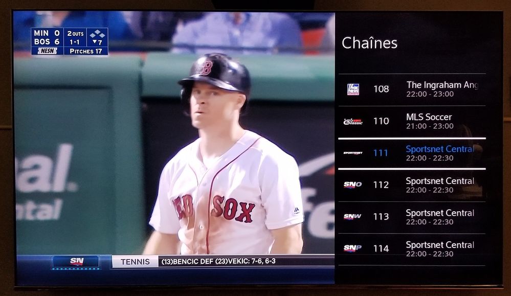 - Appuyer sur le bouton C de la télécommande affiche l'Appli Sports. On se déplace de gauche a droite entre les différents sports ( dans le haut Favoris, LCF, MLB, NCAAF, etc.) Le triangle gris en haut à droite des cases avec un écran dedans indique que ces matchs sont diffusés. Suffit de sélectionner ce match puis choisir "Visionner"